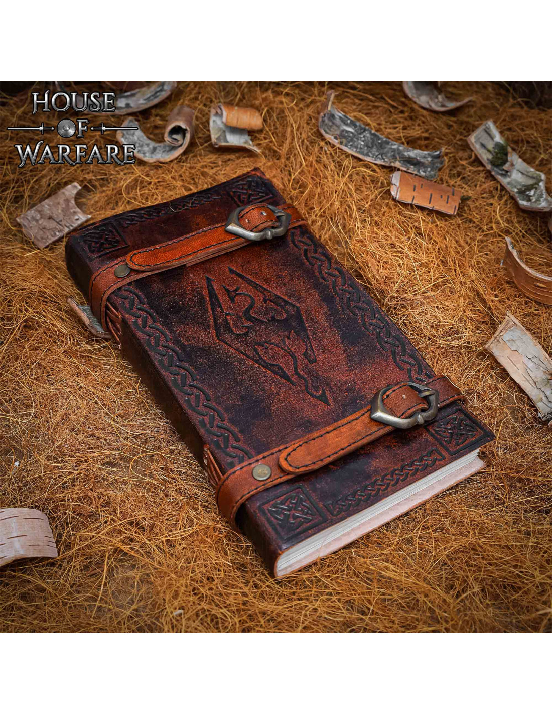 O design apresenta uma capa rígida de couro envelhecido em tons marrons e avermelhados, com um relevo central de dragão rodeado por um entrelaçado de nós celtas, que confere caráter e presença à sua mesa ou mochila. O acabamento artesanal e as variações naturais do tom fazem com que cada exemplar tenha personalidade própria, ideal para quem valoriza peças únicas feitas à mão.