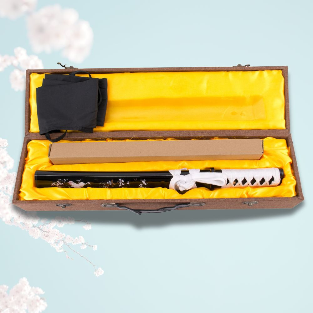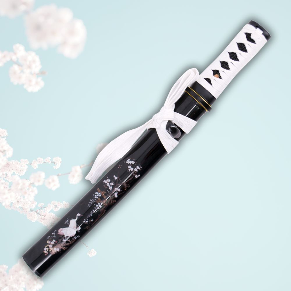 Seu estojo de madeira com acabamento preto está decorado com elegantes detalhes de flores e uma grua, o que lhe confere um ar tradicional e sofisticado. O cabo, revestido em branco com imitação de pele de raia, proporciona uma pegada firme e confortável, além de complementar esteticamente o design do estojo.