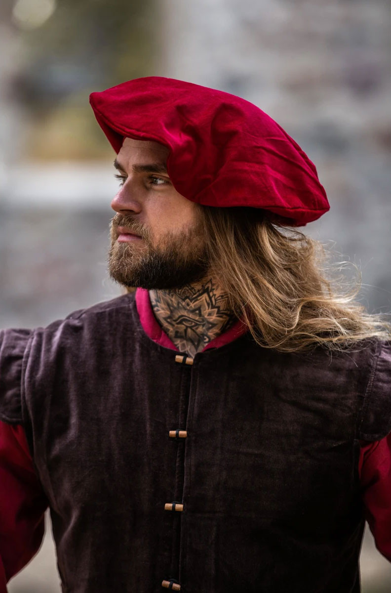 Este Parlota é perfeito para os amantes da moda renascentista que procuram uma peça de roupa de qualidade e que dure muitos anos. Adicione o Boné Renascentista de algodão vermelho Kurt ao seu guarda-roupa e surpreenda a todos com seu estilo único e elegante!