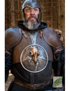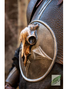 Com seu visual de couro marrom escuro equipado com placas de aço, este peitoral de poliuretano não apenas oferece proteção confiável, mas também parece incrivelmente impressionante. A placa redonda de tripa de aço ostenta o crânio de uma criatura morta, dando-lhe um toque misterioso e sedutor. Este crânio é provavelmente o resultado de algum tipo de sacrifício ritual para atrair Odin, adicionando um elemento de misticismo a esta armadura.