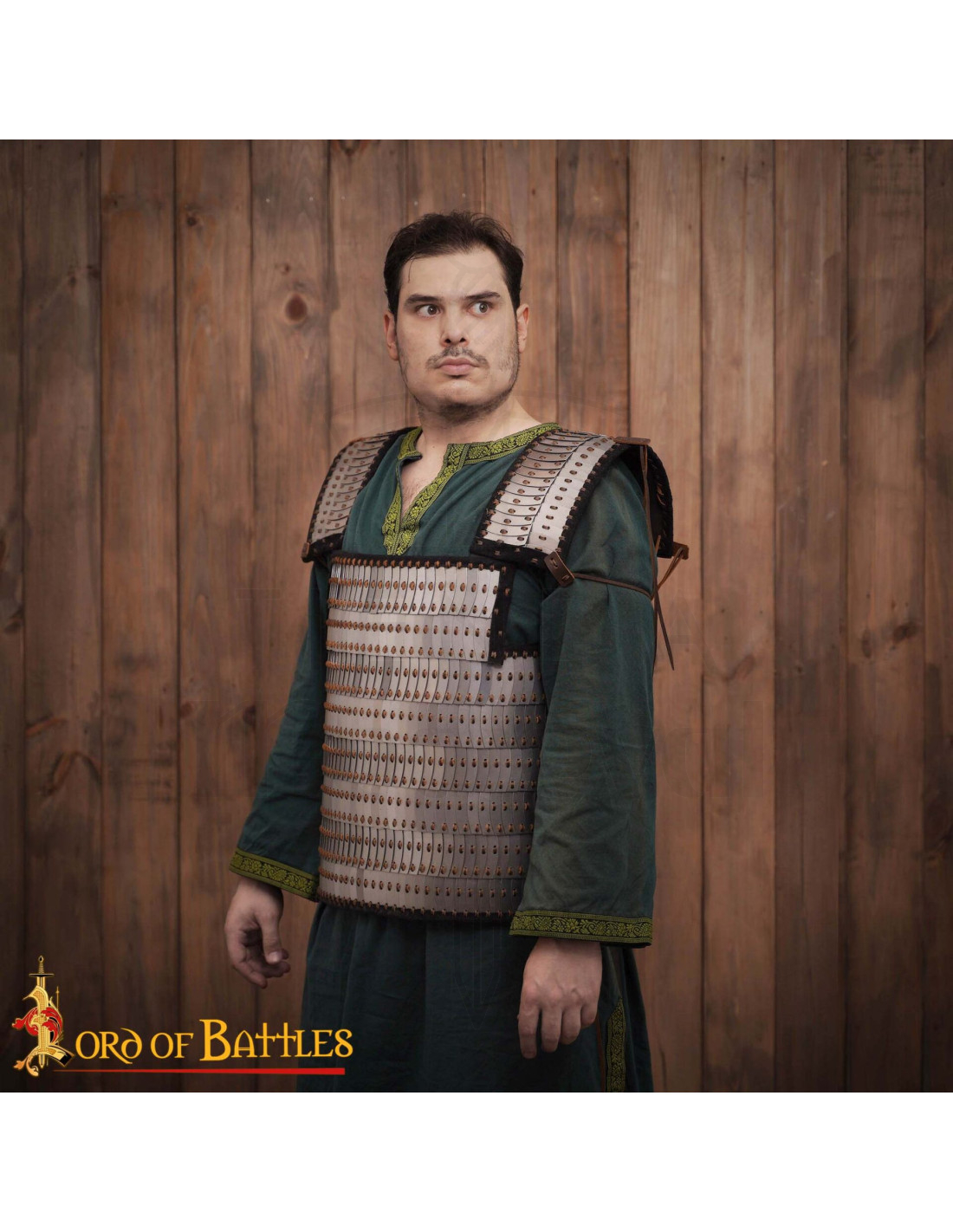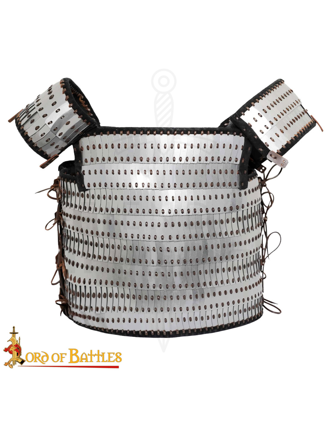 Inspirada nas tradições de armaduras lamelares de culturas vikings, bizantinas e orientais, seu design em camadas oferece uma defesa flexível e eficaz. Cada escama foi cuidadosamente remachada a uma base de couro reforçado, permitindo movimento natural sem sacrificar a proteção, ideal para combates, ensaios ou exibições. Seu acabamento brilhante em prata e os detalhes em marrom proporcionam um toque autêntico e chamativo, enquanto suas correias ajustáveis nos ombros e laterais garantem um ajuste perfeito e personalizado.