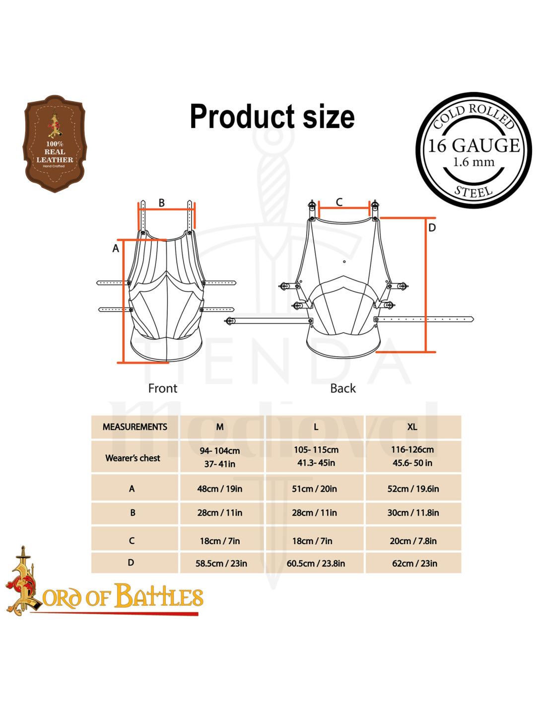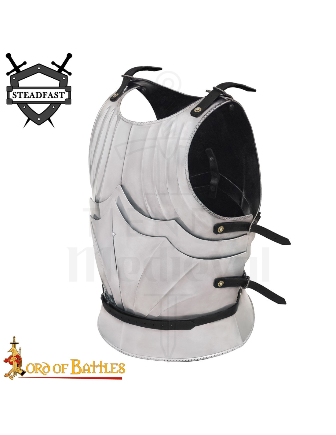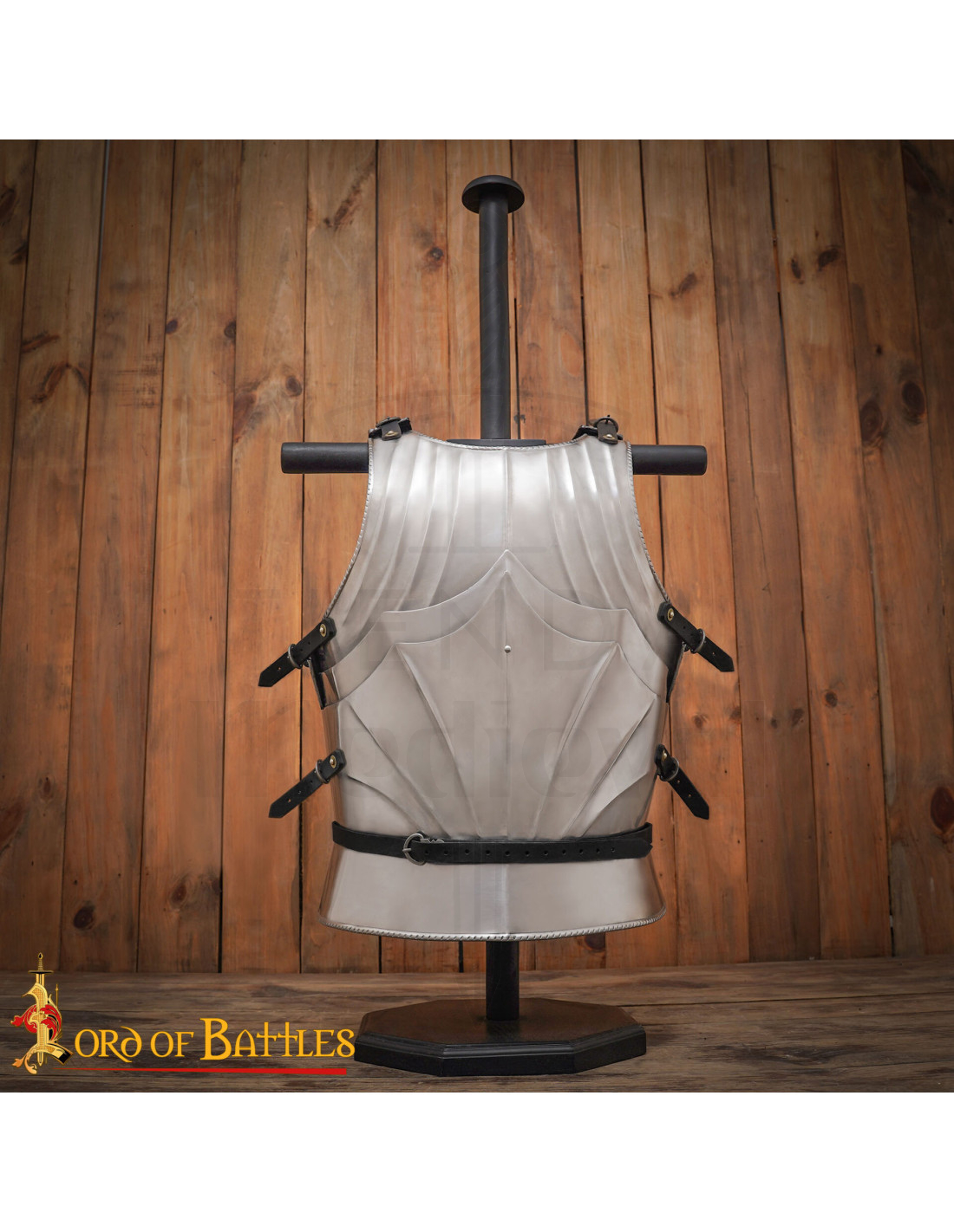 Inspirada na armadura dos séculos XV e XVI, esta cota de malha reflete a evolução do equipamento defensivo dos cavaleiros europeus. Seu design canalizado, típico da era gótica, não só proporciona um impacto visual impressionante como também reforça a estrutura, oferecendo maior resistência aos golpes sem adicionar peso extra. A combinação de linhas curvas e detalhes decorativos faz desta peça algo funcional e esteticamente impactante.