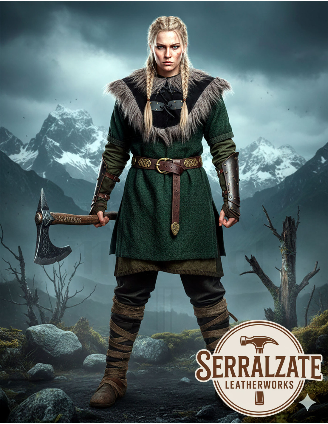 O fechamento frontal, projetado com placas de couro e cordões de ajuste, traz praticidade e um ar rústico que completa seu design único. Os botões decorativos em tons dourados ou bronze se destacam sobre o conjunto, fazendo deste gorjal uma escolha chamativa tanto para ocasiões formais quanto para looks inspirados em temáticas épicas ou medievais.