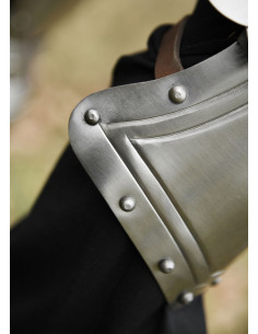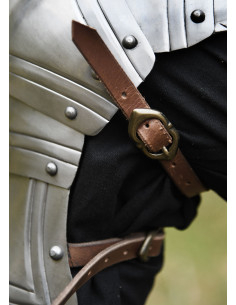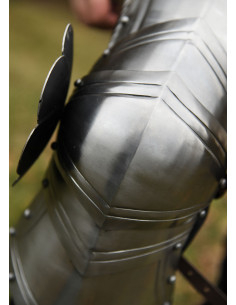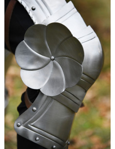 Os detalhes não passam despercebidos: as bordas decoradas com ranhuras e pequenos rebites de aço, juntamente com os rondels nas joelheiras em forma de flor, dão um toque de elegância letal. Esta armadura articulada é perfeita tanto para reconstituições históricas quanto para incorporar personagens fictícios ou de fantasia em eventos de role-playing ao vivo (LARP), teatro, televisão/filme, fantasias ou cosplay.