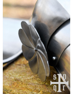 Os poleyns possuem adornos em forma de flor nas laterais, acrescentando um detalhe distintivo e refinado. As três correias de couro com fivelas de latão permitem um ajuste personalizado, garantindo conforto e estabilidade.