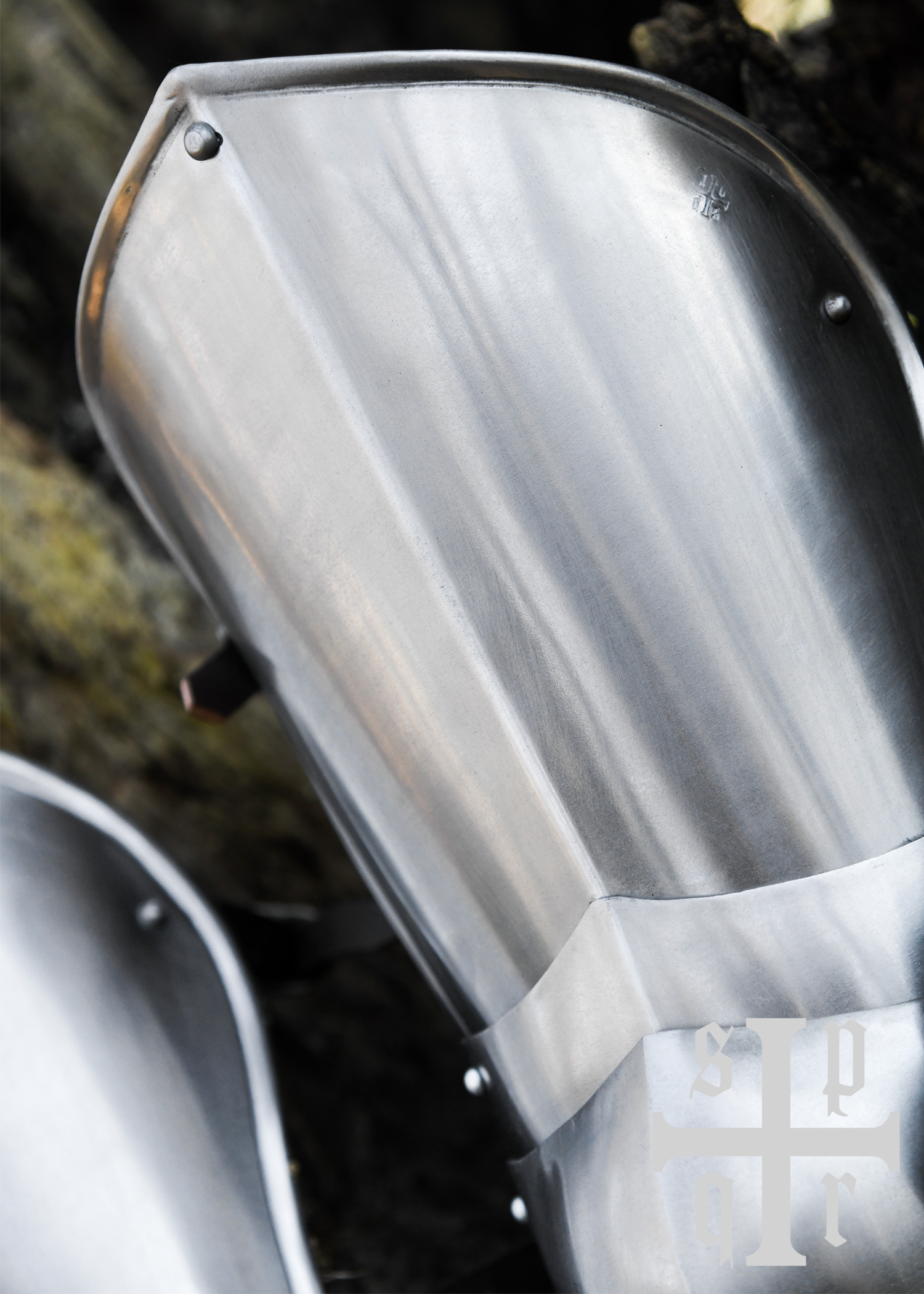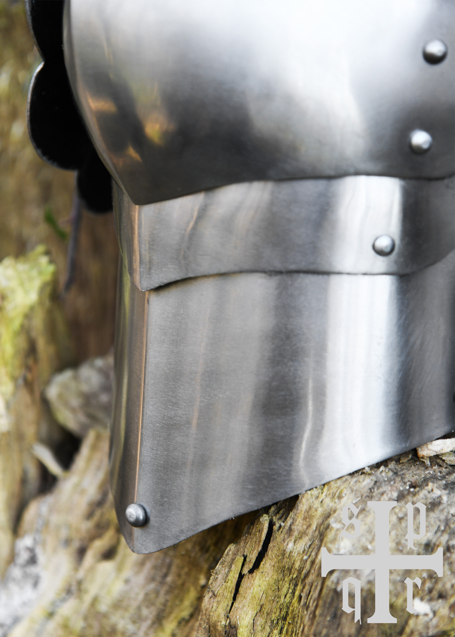 Fabricados à mão com aço de 1,6 mm (16 ga), esses protetores de pernas são tratados internamente com um acabamento preto para melhorar a resistência à corrosão, garantindo maior durabilidade. O conjunto inclui poleyns (joelheiras), cuisses (proteção para as coxas) e grebas curtas para as panturrilhas. Cada parte está unida por lâminas deslizantes ou placas articuladas, fixadas com rebites de aço para garantir um movimento fluido e confortável durante o combate ou as recriações históricas.