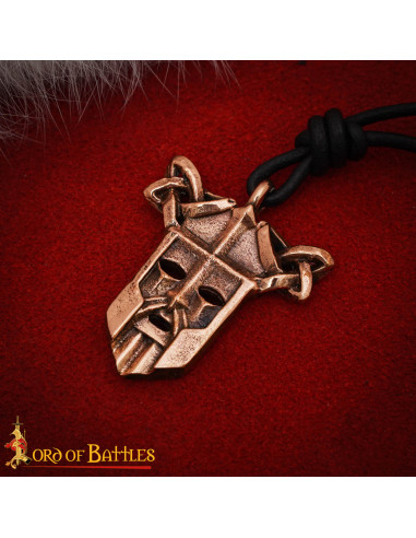 Imagine levar consigo a presença imponente de um guerreiro nórdico a cada passo? Esta peça chama atenção instantaneamente, graças à sua máscara estilizada e ao acabamento cobre que parece contar histórias de batalhas e lendas.