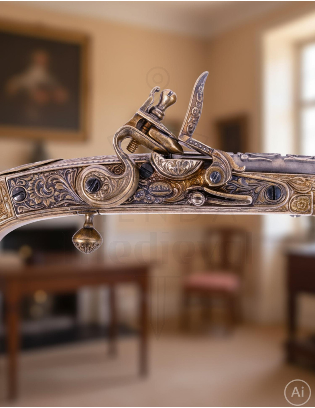 O mecanismo visível de pederneira e o detalhado percutor evocam o funcionamento original dessas armas, tornando-a um testemunho fiel da engenharia histórica. Adicionalmente, incorpora um pequeno gancho decorativo na parte traseira, ideal para aqueles que desejam expô-la em sua casa como um item de decoração destacado.