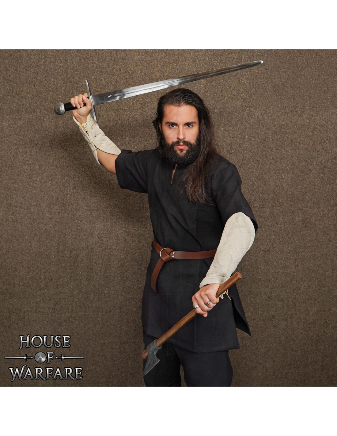 Cada par é confeccionado com costuras visíveis e mão de obra cuidadosa, garantindo um aspecto trabalhado e resistência pensada para uso frequente em SCA, reencenações e teatro de combate. Além disso, o acabamento texturizado do tecido e o tom creme integram-se com uma ampla variedade de trajes históricos e de fantasia.