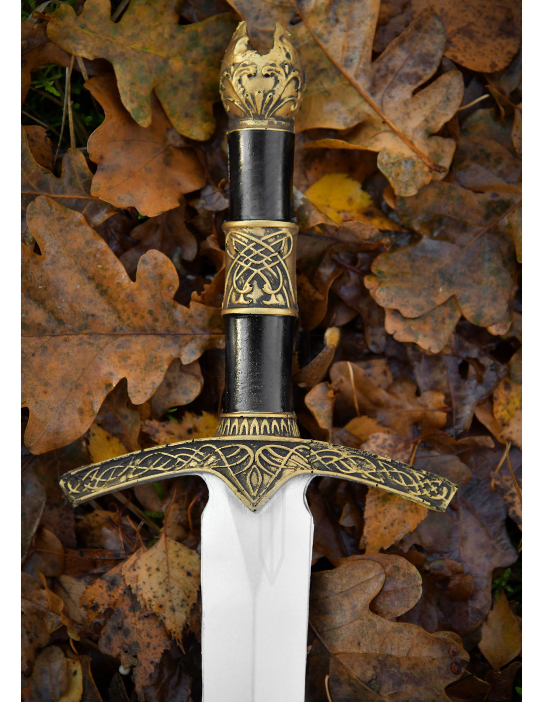A guarda em tom dourado envelhecido, ricamente ornamentada, e o cabo preto com anéis dourados gravados, oferecem um ponto focal visual que complementa qualquer vestuário, desde a túnica de um mago até a capa de um cavaleiro. O pomo com forma que evoca uma coroa ou uma flor estilizada adiciona um toque elegante, ideal para quem se preocupa com cada detalhe do traje.