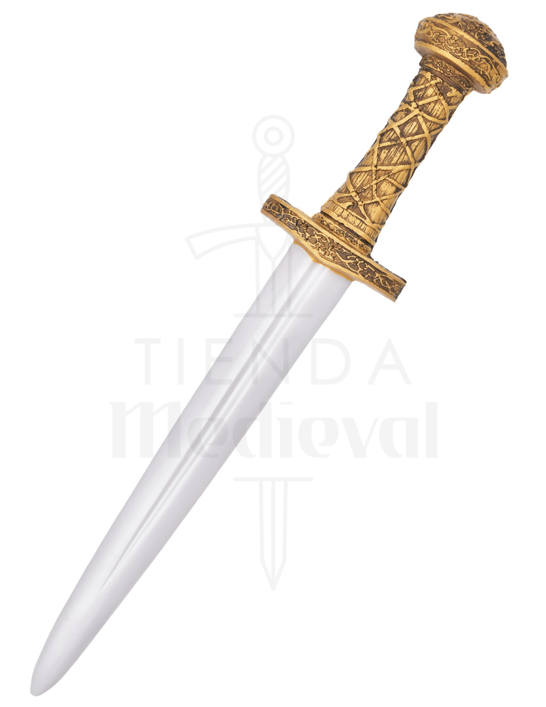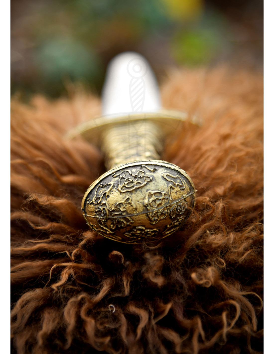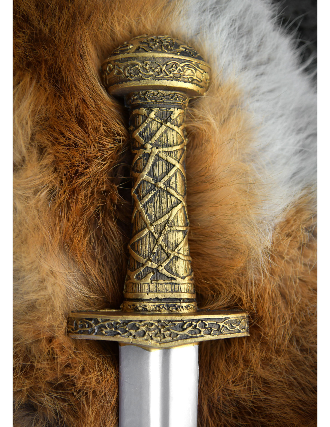 A empunhadura em tom dourado, com relevos que evocam motivos nórdicos e celtas, transforma um simples agarre em um ponto de orgulho. Essa textura talhada não apenas parece autêntica, mas também facilita um agarre firme e confortável, ideal para movimentos rápidos e controlados. A guarda dourada e o pomo arredondado, decorado com padrões gravados, completam um design que transmite autoridade e tradição.