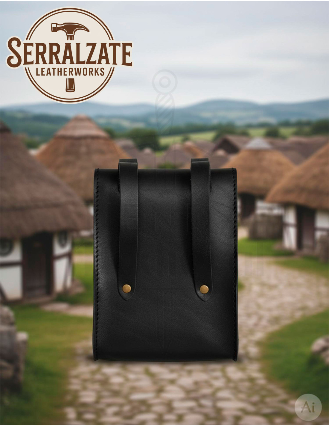 O design retangular e as costuras visíveis destacam um acabamento cuidadoso e reforçado, pensado para suportar o trânsito em feiras e jornadas de LARP. As duas alças traseiras permitem fixá-la com estabilidade em diferentes tipos de cintos, a correia inferior com fivela oferece ajuste para maior segurança, e o formato compacto guarda o essencial sem atrapalhar, facilitando a mobilidade em eventos com muita atividade.