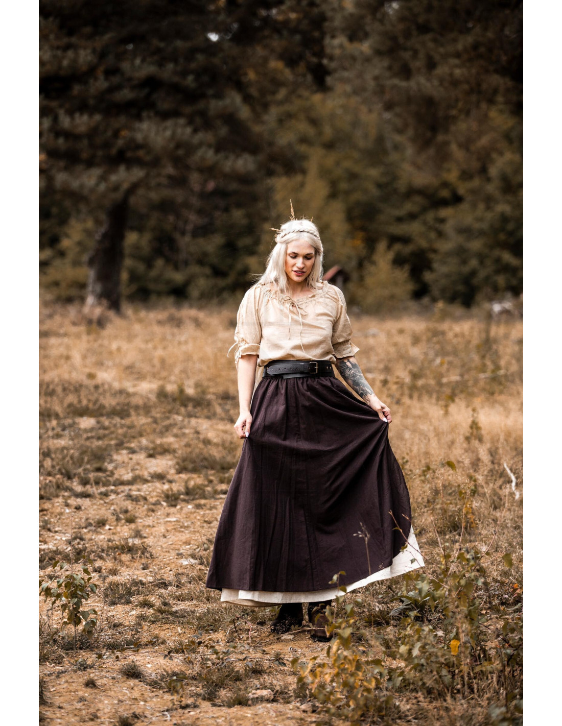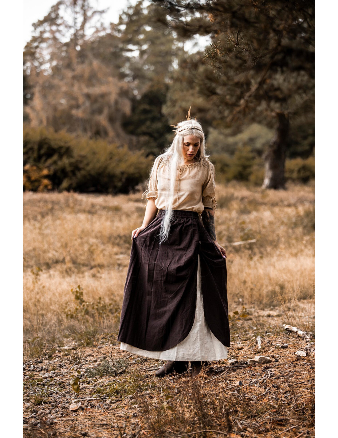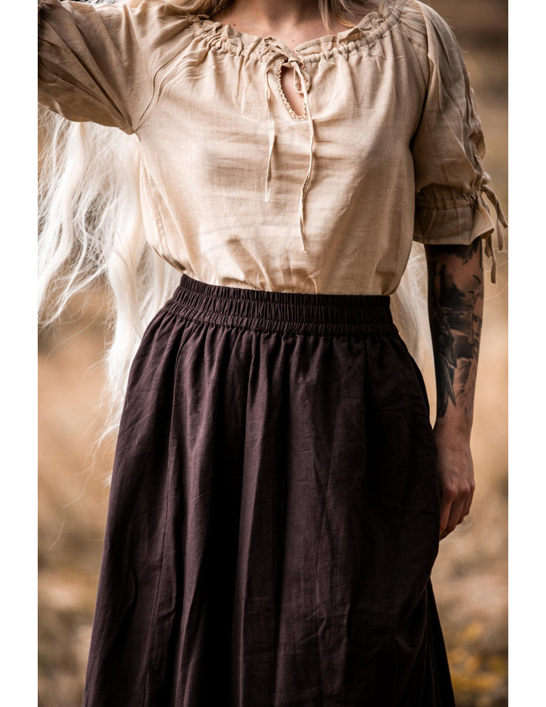 Comprar a Saia Medieval modelo Elise Marrom-Natural significa escolher uma peça versátil, que funciona tanto em recriações históricas quanto em looks de rua com um toque distinto. Sua paleta em tons de marrom e natural facilita combinações com capas, cintos ou botas, oferecendo variedade sem perder a coerência estética.
