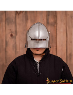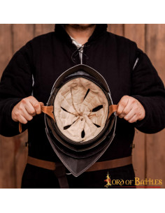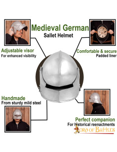 Não economize na qualidade e no desempenho do seu equipamento de combate. O capacete medieval alemão Sallet com forro acolchoado, da conceituada marca Lord of Battles, foi concebido para suportar os rigores da batalha e oferecer-lhe a melhor proteção possível. O material utilizado, aço macio, é durável e resistente, garantindo a proteção de sua cabeça em todos os momentos.