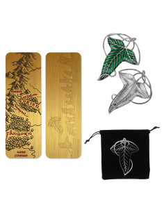 Este kit combina estilo e funcionalidade para quem valoriza detalhes: dois broches em forma de folha, um com interior esmaltado em verde e outro com acabamento metálico e veias gravadas, oferecem um toque elegante e reconhecível que transforma qualquer peça de roupa em um sutil aceno à obra. A bolsinha de veludo proporciona proteção confortável e portátil, e os marca páginas metálicos dourados com acabamento escovado oferecem presença, suavidade ao deslizar entre as páginas e resistência para uso diário.