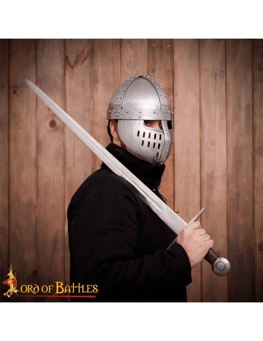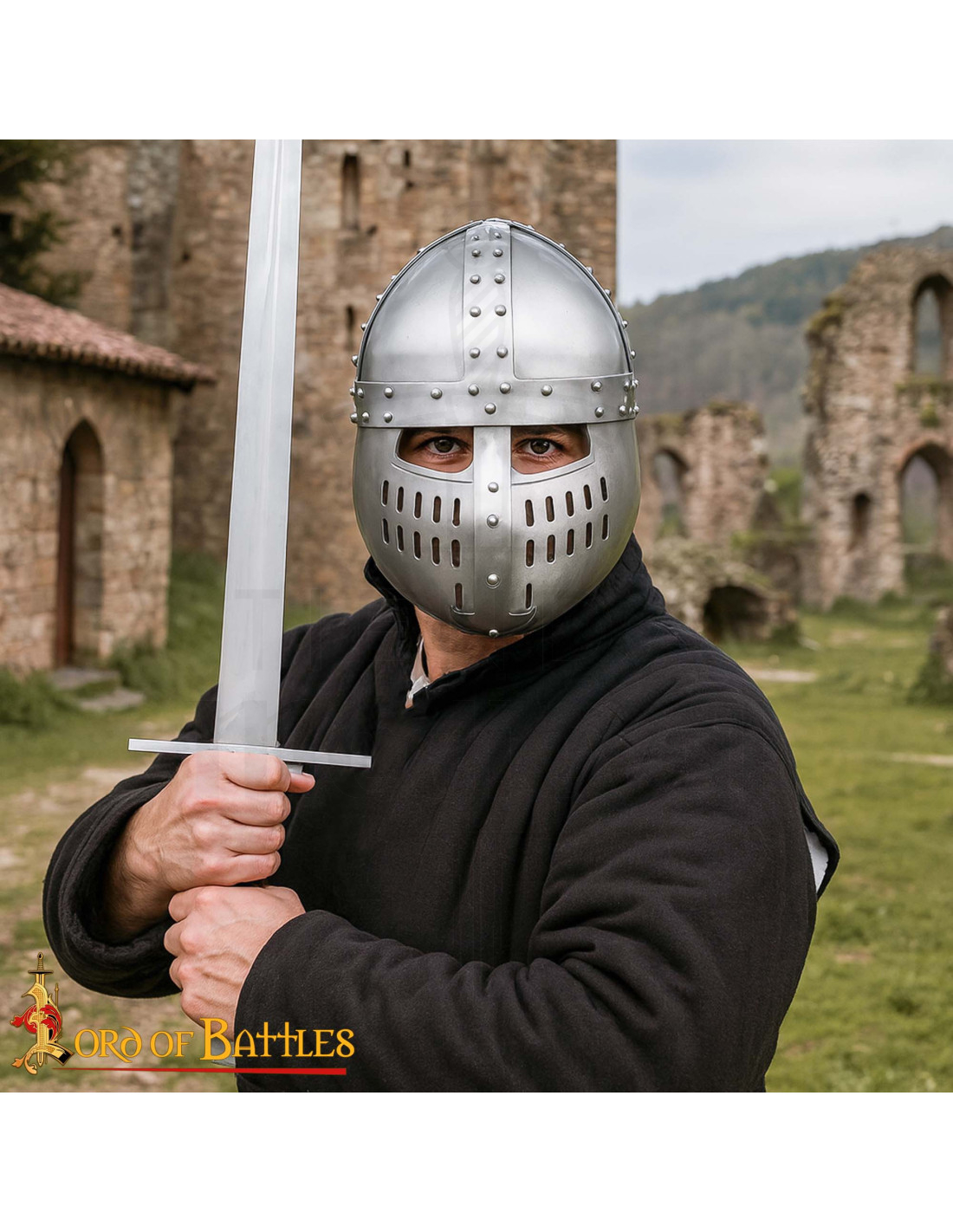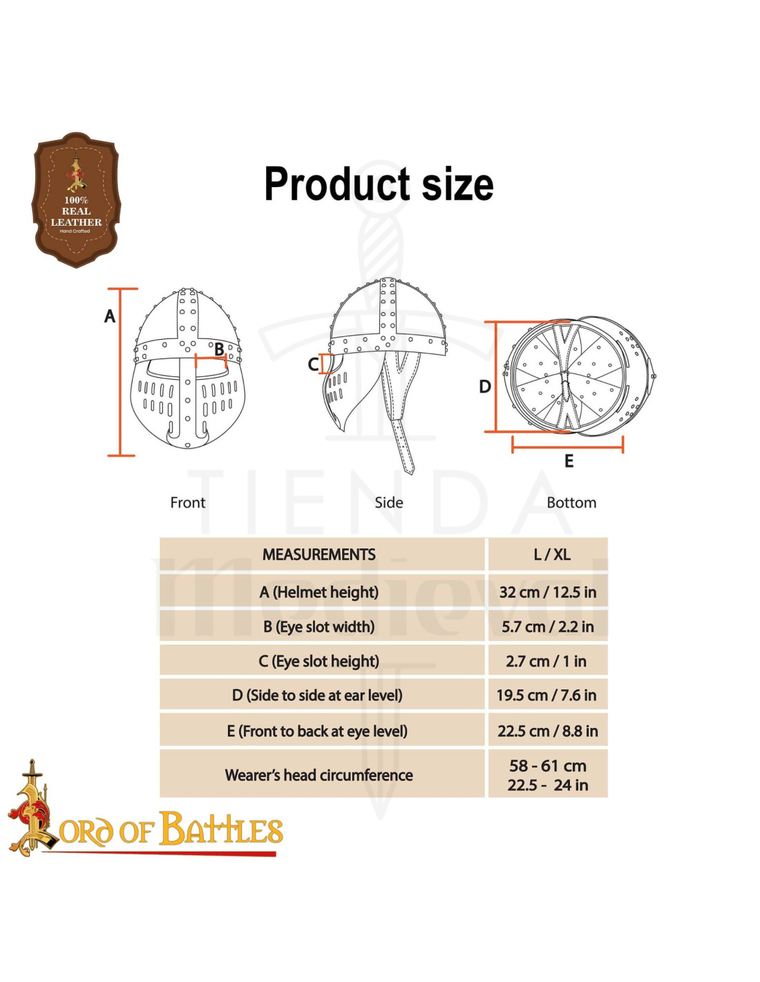 Fabricado em aço suave de 16 gauge, combina segurança contra golpes, flechas e ferimentos com um peso manejável para uso prolongado. A cúpula segmentada e rebitada garante durabilidade e autenticidade, enquanto a viseira e o barboquejo de couro com fivela asseguram um ajuste confortável e seguro em qualquer situação, desde recriações históricas até exposições ou eventos LARP.