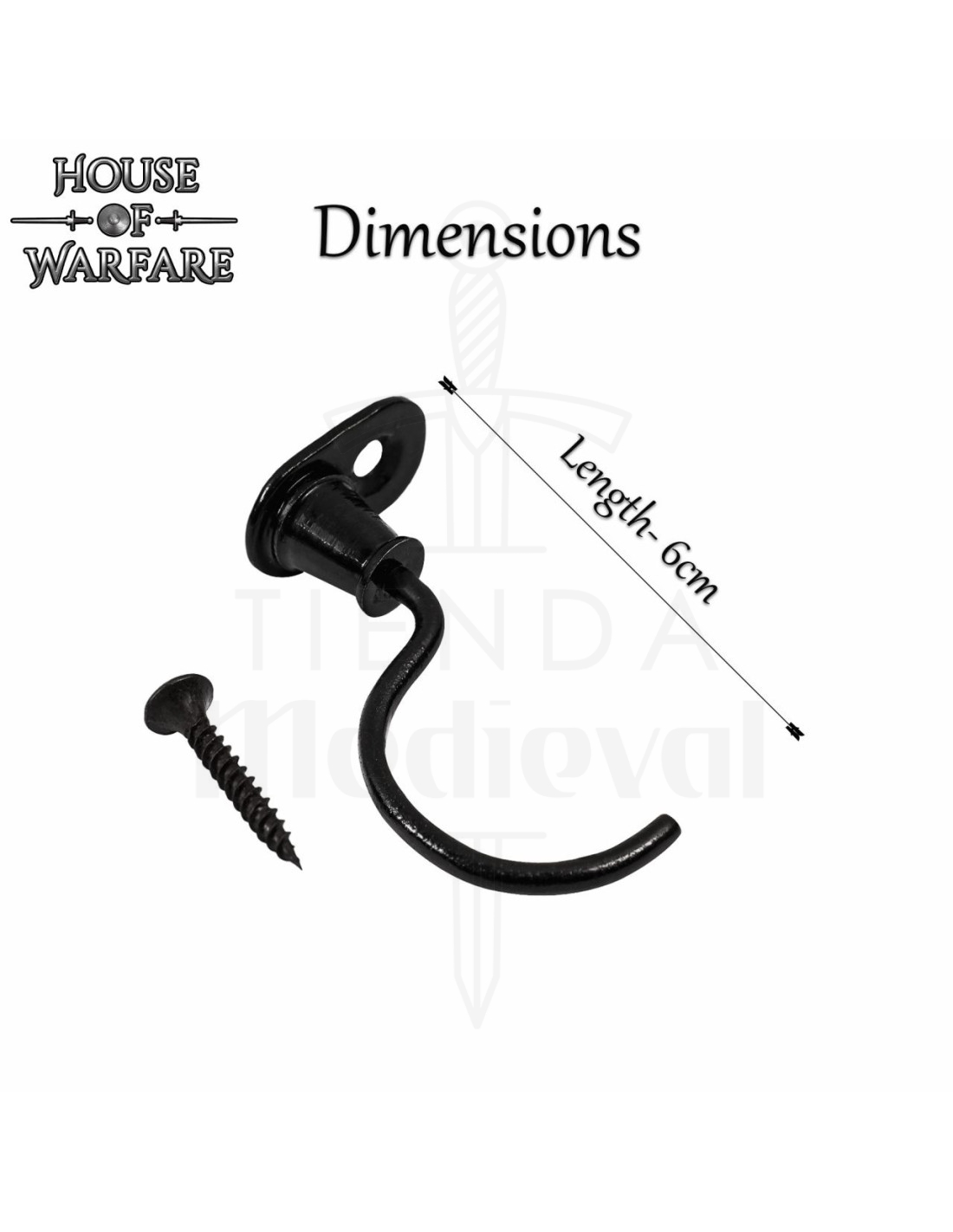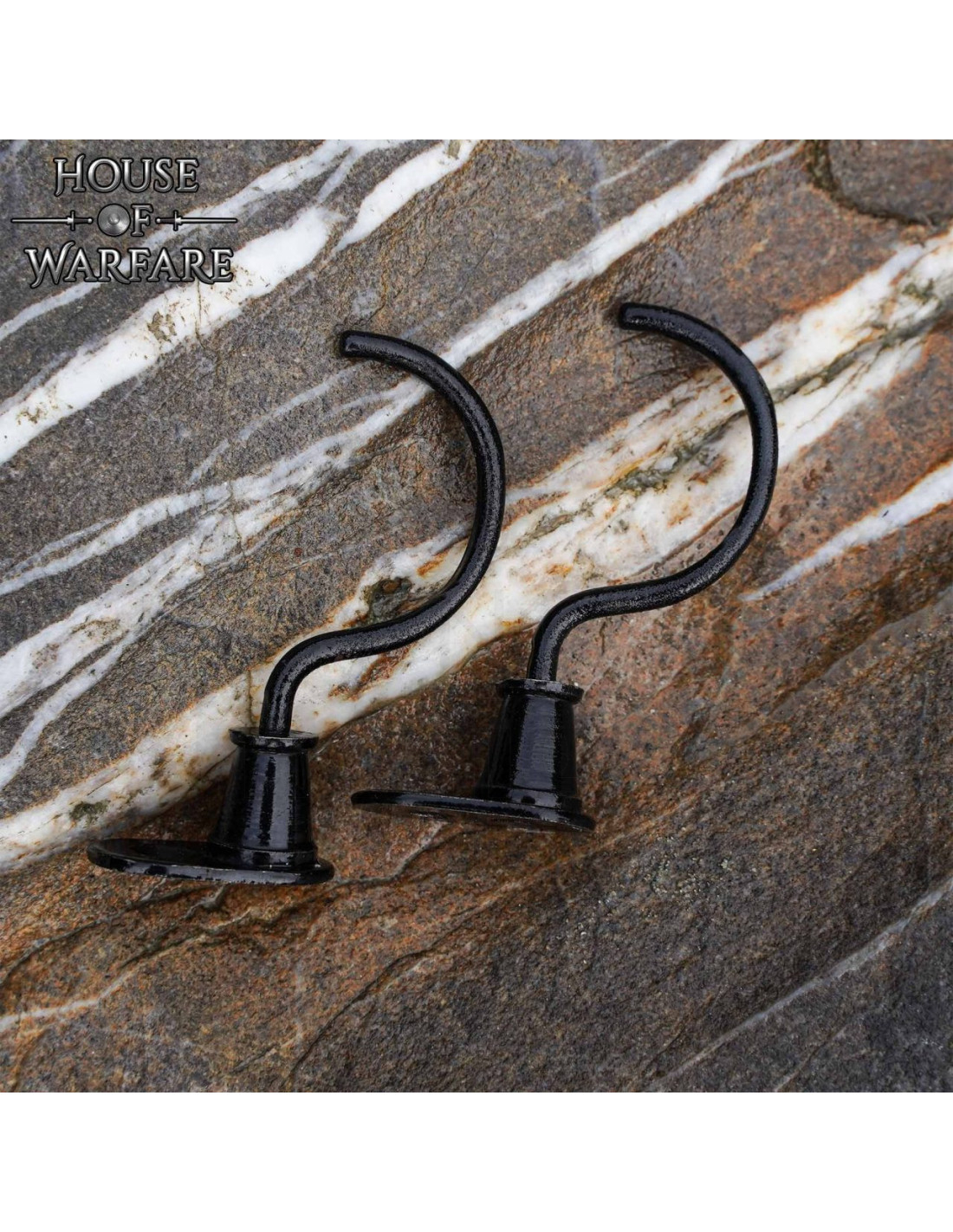 Este par de suportes medievais oferece uma solução pronta para instalar, pensada para quem busca um toque medieval sem abrir mão da segurança. O acabamento em preto traz discrição e elegância, fazendo com que as peças que você pendurar se destaquem sem competir com a decoração. A curva em forma de 'U' segura os objetos evitando deslizamentos, e a base com furo para fixação garante uma montagem estável em superfícies verticais.