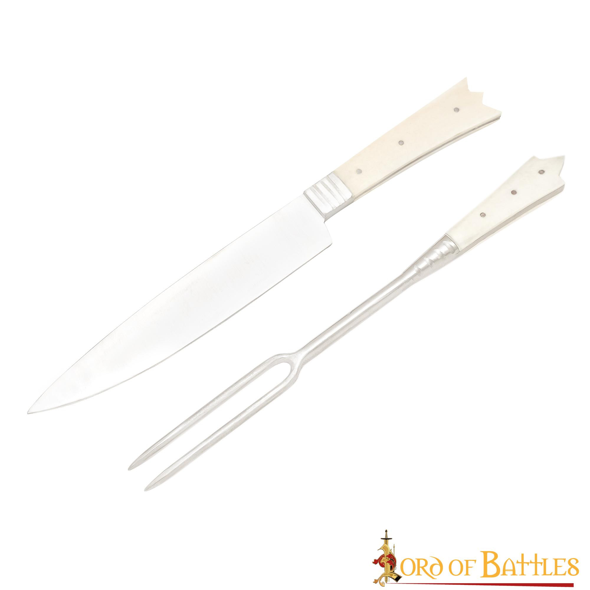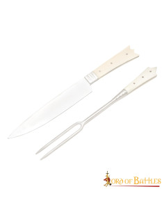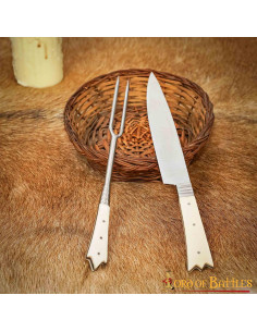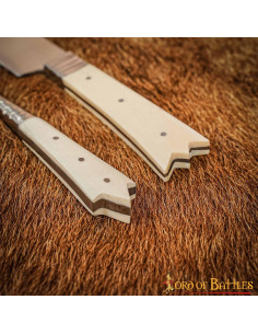 Conjunto de 2 talheres medievais com ameias e capa em pele - cabo em osso