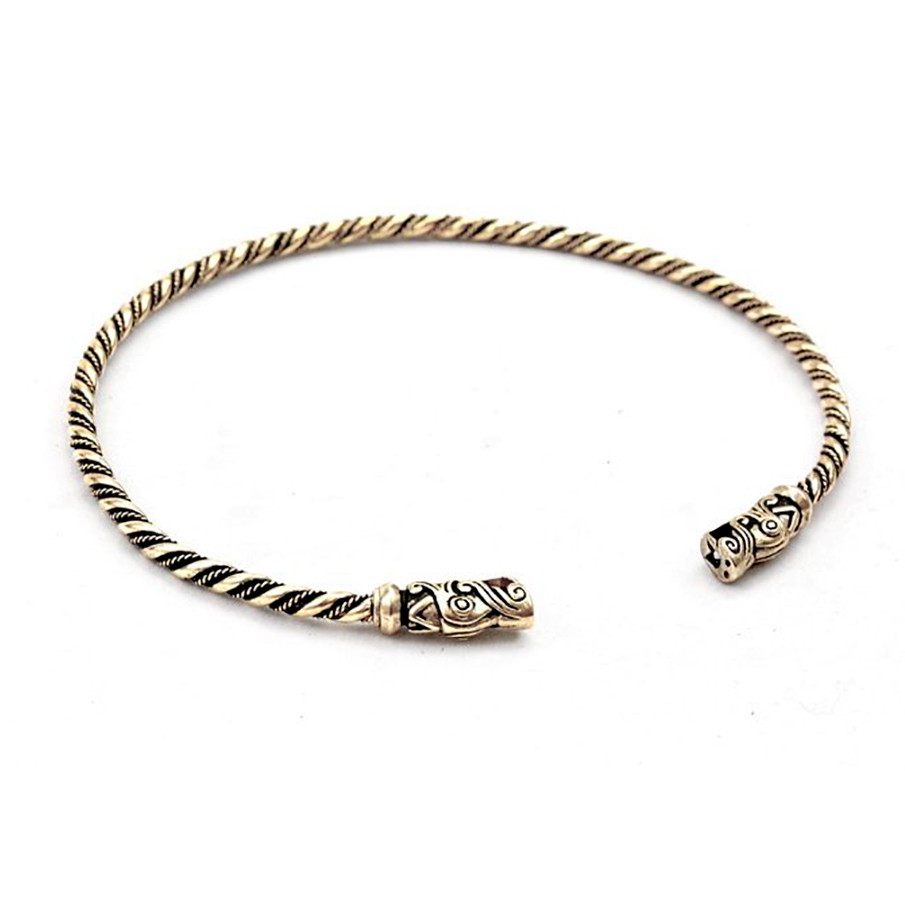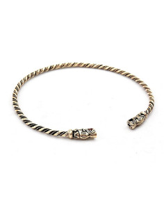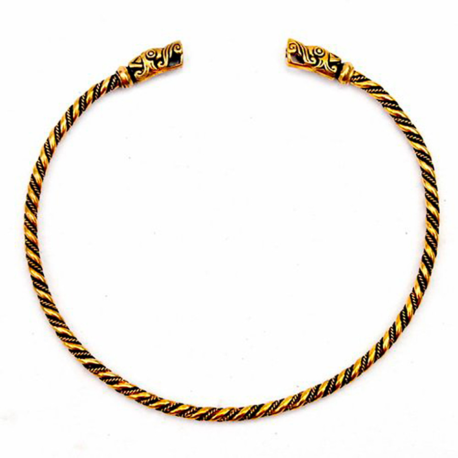 O Torque Viking Gotland Dragon heads é um colar histórico inspirado nos modelos Viking. É um colar de vários fios de bronze torcidos que tem um desenho de cabeças de dragão, homenageando a fascinante cultura viking. Este modelo em particular é uma réplica histórica baseada em designs encontrados na ilha sueca de Gotland.