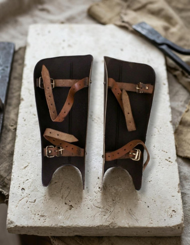 Sua versatilidade permite adaptar-se a diferentes tamanhos de perna, tornando essas grebas um complemento ideal para qualquer amante da história ou da fantasia. Sua fabricação artesanal assegura um acabamento impecável em cada detalhe, desde as costuras até os acabamentos. Com sua cor predominante preta e acentos metálicos, essas peças irradiam caráter e força.