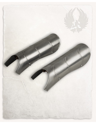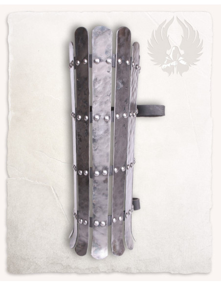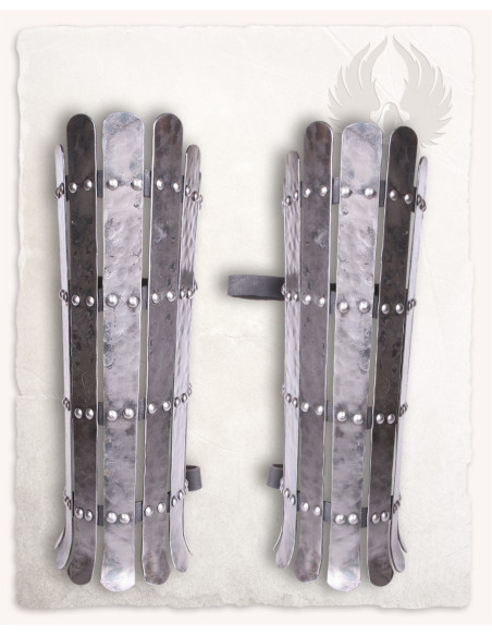 O design em tiras verticais unidas por rebites se traduz em uma proteção que se adapta à perna, permitindo liberdade de movimento onde mais importa. As correias de couro traseiras e os fechos com fivelas de ferro forjado garantem um ajuste firme e personalizável, sem sacrificar a facilidade de colocação ou remoção. O acabamento polido realça a textura martelada, conferindo um ar artesanal e uma estética cuidada que capta a luz a cada movimento.