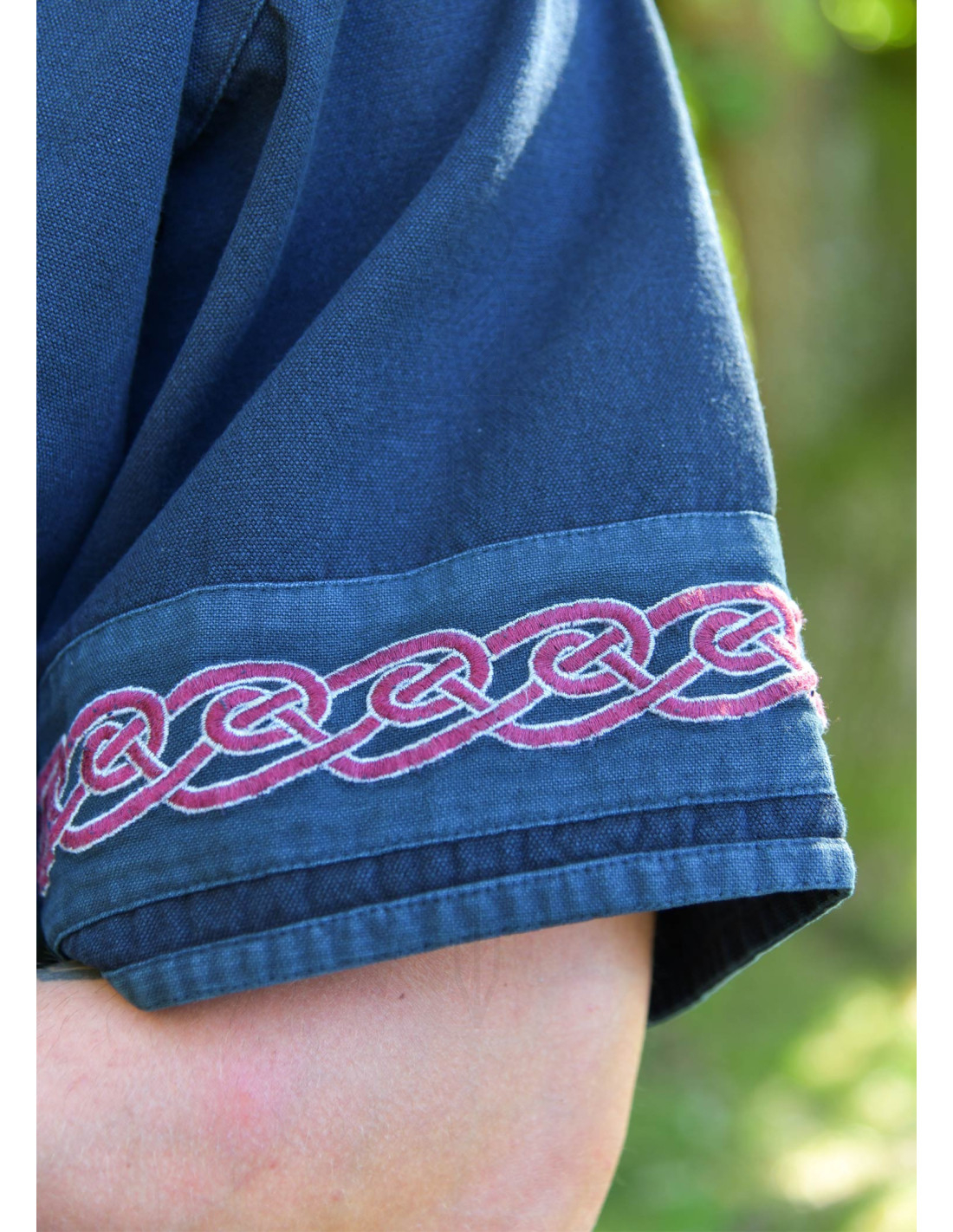 Seu decote em forma de 'V' com abertura, decorado com trançados em tons de vermelho e cinza escuro, traz um toque elegante sem perder a essência guerreira. A artesania nos detalhes, como as costuras de reparo no colarinho e na bainha, reflete seu caráter resistente. As mangas curtas e largas, adornadas com padrões trançados inspirados na cultura celta, oferecem total liberdade de movimento, ideal para reencenações, LARP ou feiras medievais.