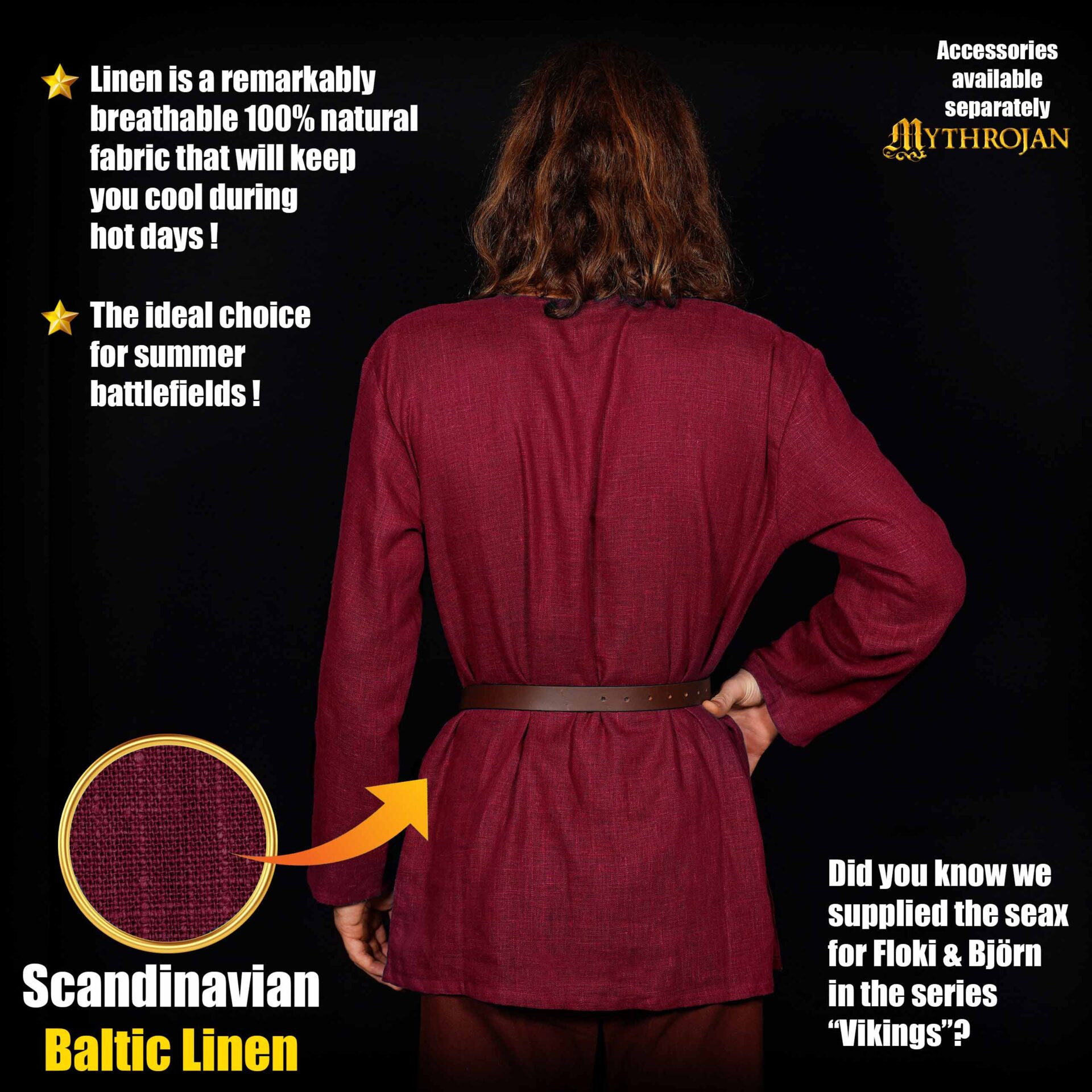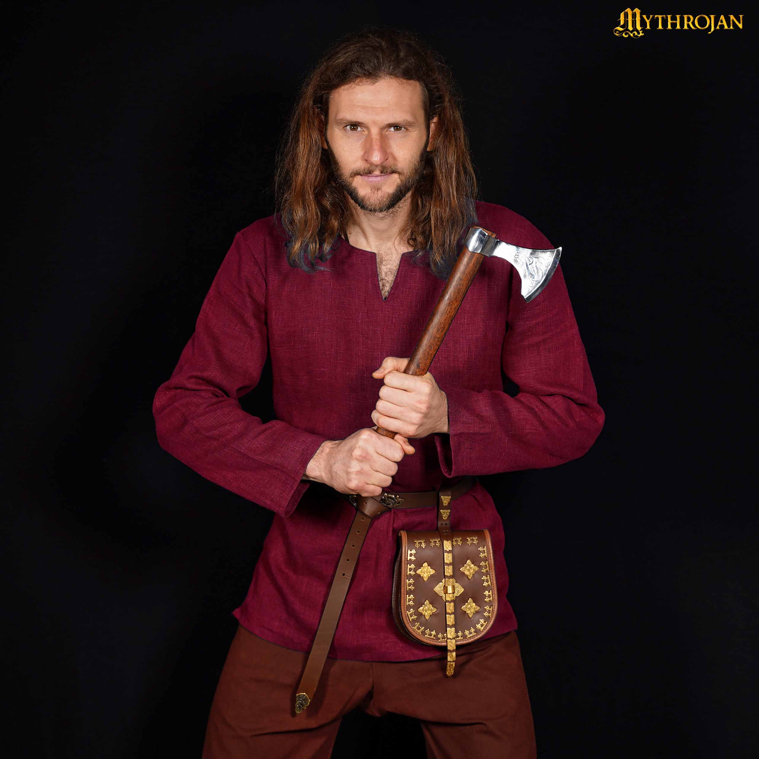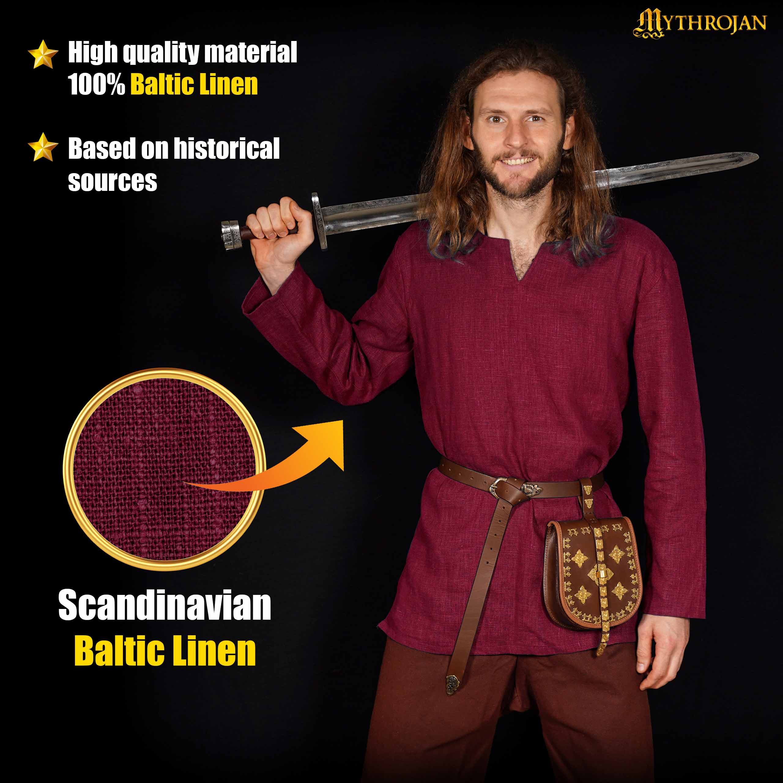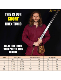 Você já sonhou em parecer um verdadeiro guerreiro viking? Esta túnica de linho em um elegante tom vermelho vinho irá transportá-lo diretamente para a era dos exploradores nórdicos, combinando autenticidade e conforto em uma única peça. Projetada com um corte que favorece a mobilidade e um estilo inspirado em fontes históricas, seu comprimento ideal oferece um equilíbrio perfeito entre conforto e estilo, adaptando-se a quem prefere essa altura para um visual mais relaxado e autêntico.