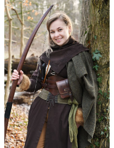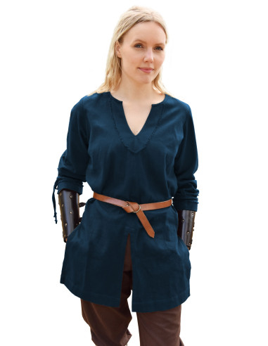 Os cordões que vão do pescoço até a cintura permitem ajustar o tamanho para um ajuste personalizado e o vestido pode ser desmontado completamente se todos os cordões forem removidos. Além disso, as mangas também são amarradas com cordões e podem ser facilmente retiradas. Este vestido é ideal para representar mulheres da vida cotidiana na época medieval, como uma taberneira, uma camponesa ou uma mulher vikinga. Combine-o com uma camisa por baixo para um visual autêntico e confortável!