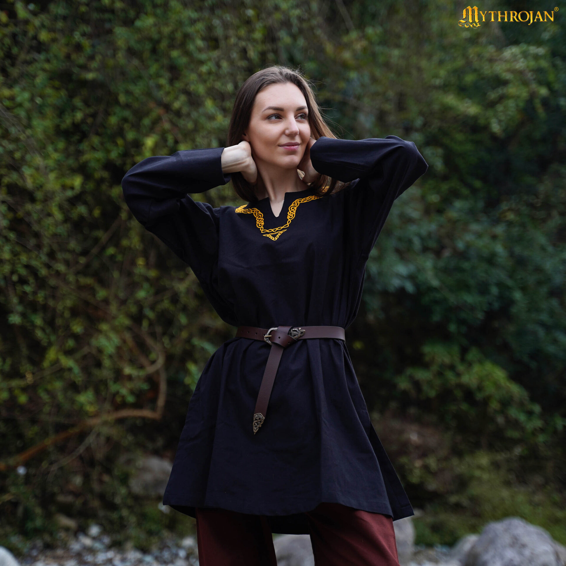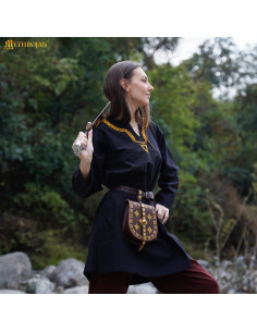 Seu bordado requintado, feito com pontos delicados, reflete os intrincados desenhos da era medieval, tornando cada peça única e especial. É confeccionada com algodão de alta qualidade, macio na pele e muito respirável, para que você possa parecer espetacular sem abrir mão do conforto ao longo do dia. Graças ao seu corte amplo e mangas longas, oferece uma silhueta favorecedora e uma sensação de liberdade em movimento. Além disso, o design em V do decote e o cinto marrom destacam a figura, acrescentando um toque moderno a um estilo clássico.