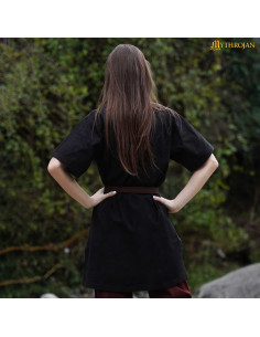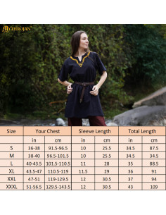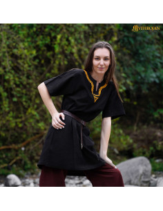 Seu design inspirado em roupas da Idade Média e da Era Viking apresenta uma gola bordada com padrões trançados, um detalhe que homenageia os têxteis encontrados em descobertas arqueológicas e a arte medieval. Disponível em opções de manga curta e longa, adapta-se tanto às jornadas quentes de festival quanto às noites mais frescas. Você pode usá-la solta para um estilo descontraído ou ajustá-la com um cinto, como mostrado na imagem, para acentuar a silhueta e dar caráter ao seu visual.