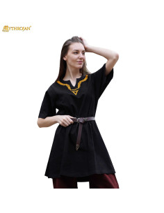Túnica vikinga de algodão com gola bordada para mulher, cor preta