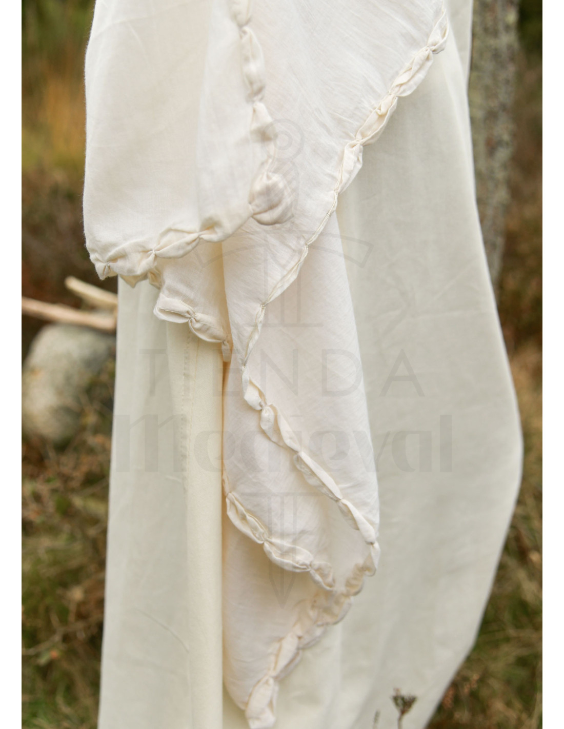 Um aceno à história, as mangas largas e as peças interiores semelhantes já eram símbolo de status na Alta Idade Média, e no século XV eram exibidas sob cotehardies mais justas, conferindo ao conjunto um caráter autêntico com raízes documentadas em frescos e manuscritos medievais.
