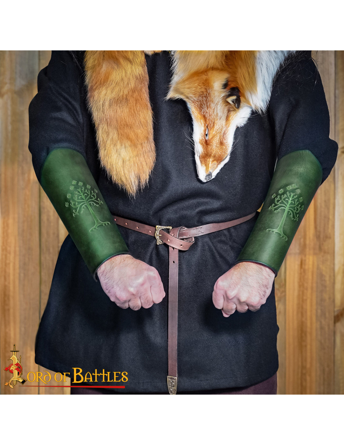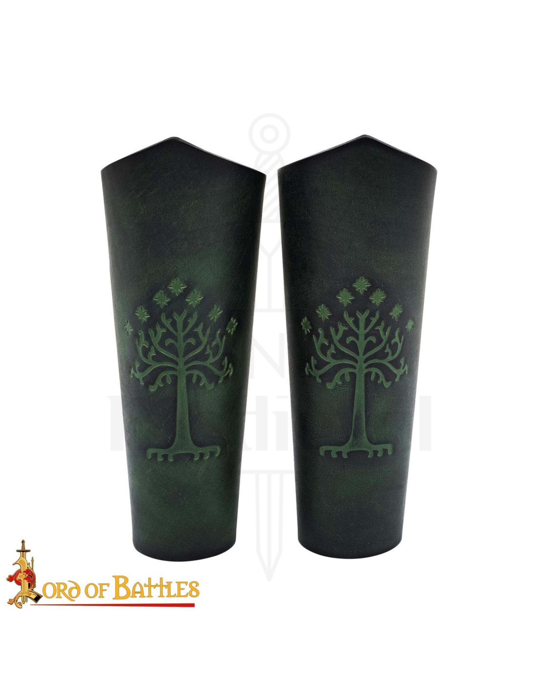 Os Brazales de couro para ranger com gravura Minas Tirith oferecem uma presença que se nota instantaneamente, graças ao seu acabamento verde escuro com sutil degradê e ao relevo da árvore estilizada com as sete estrelas, símbolos que evocam a resistência de Gondor. O design cônico, mais largo na parte superior e mais estreito em direção ao pulso, e o corte superior em ângulo foram pensados para se adaptar ao gesto natural do braço, permitindo liberdade ao usar arco ou espada e trazendo confiança a cada movimento.