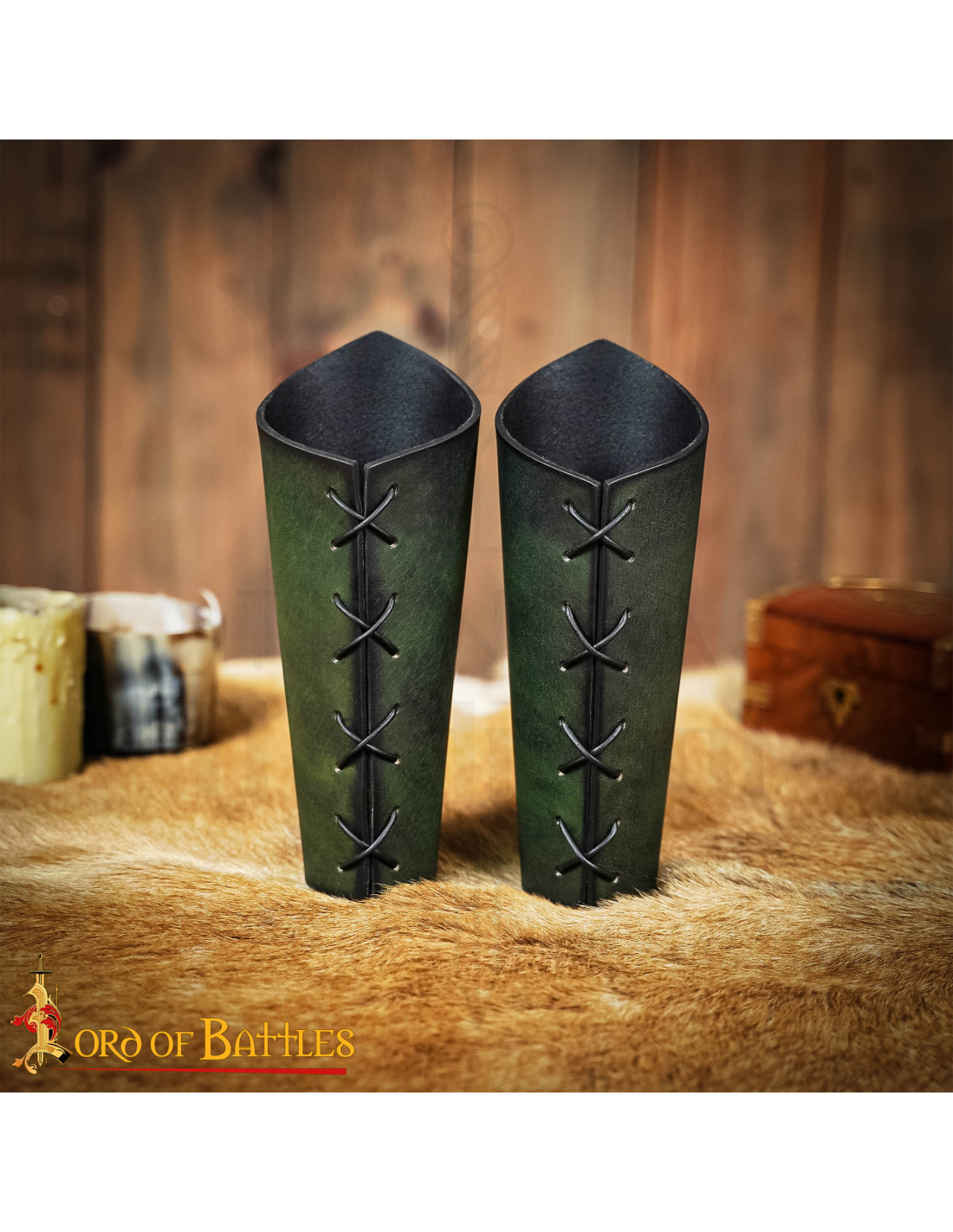 Fabricados em couro rígido com aparência de alta qualidade, protegem a área do antebraço sem abrir mão do estilo; com o tempo, a superfície ganha caráter, integrando-se ao seu equipamento e contando pequenas histórias de uso. As cordas de ajuste em couro permitem um encaixe personalizado, facilitando colocá-los e mantê-los firmes em atividades como cosplay, LARP ou passeios ao ar livre.