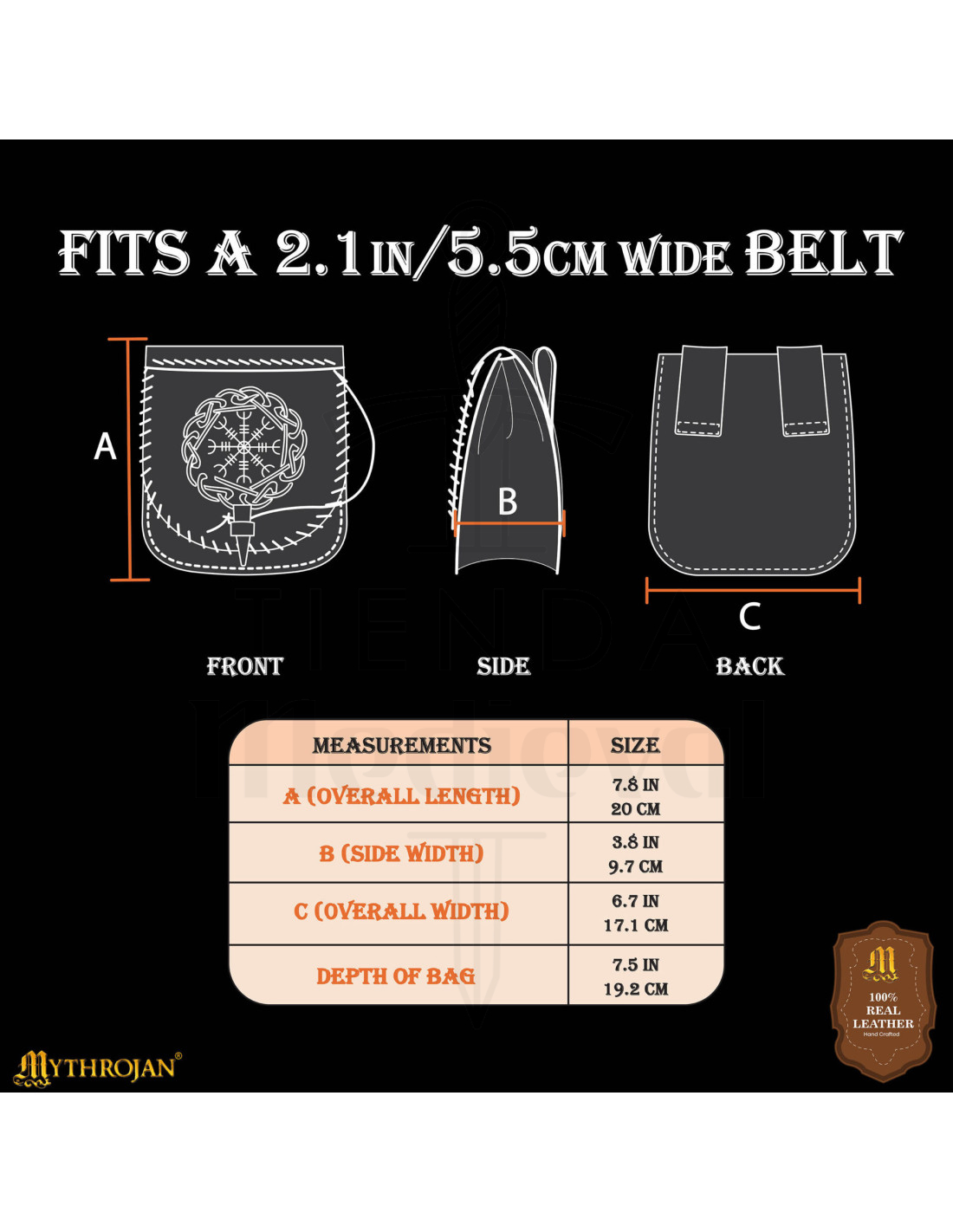 A aba exibe em relevo o lendário símbolo Ægishjálmur, conhecido como o Helm of Awe, símbolo nórdico de proteção e coragem, que adiciona um toque autêntico e carregado de significado ao seu equipamento. O fecho com uma peça que lembra osso e a tira de couro não só garante seu conteúdo, mas também reforça a estética histórica que você busca em recriações e eventos.