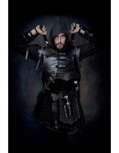 O contraste visual entre a parte superior mais suave e flexível e as placas inferiores mais brilhantes cria um equilíbrio entre elegância e robustez, perfeito para combinar com armaduras de torso ou como elemento independente que valoriza qualquer conjunto. Os metais e o brilho das placas conferem um caráter contundente e cuidado à peça.