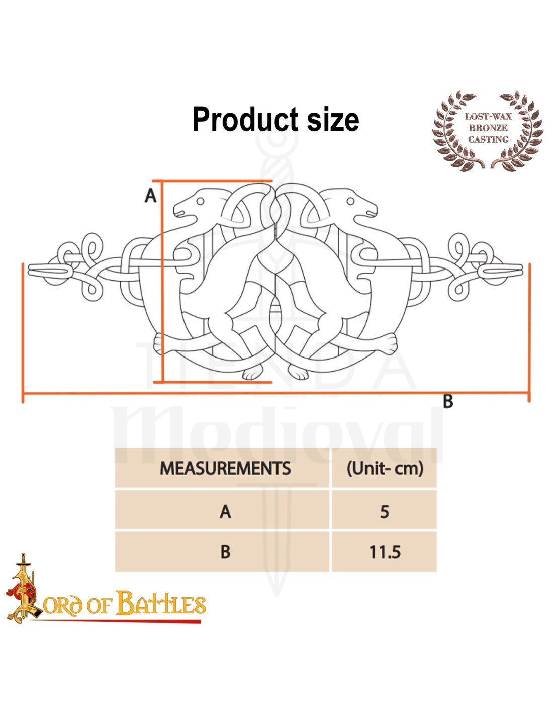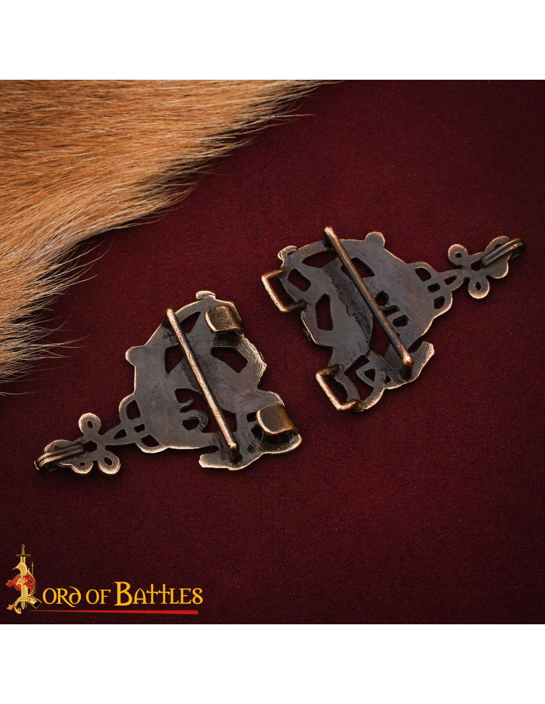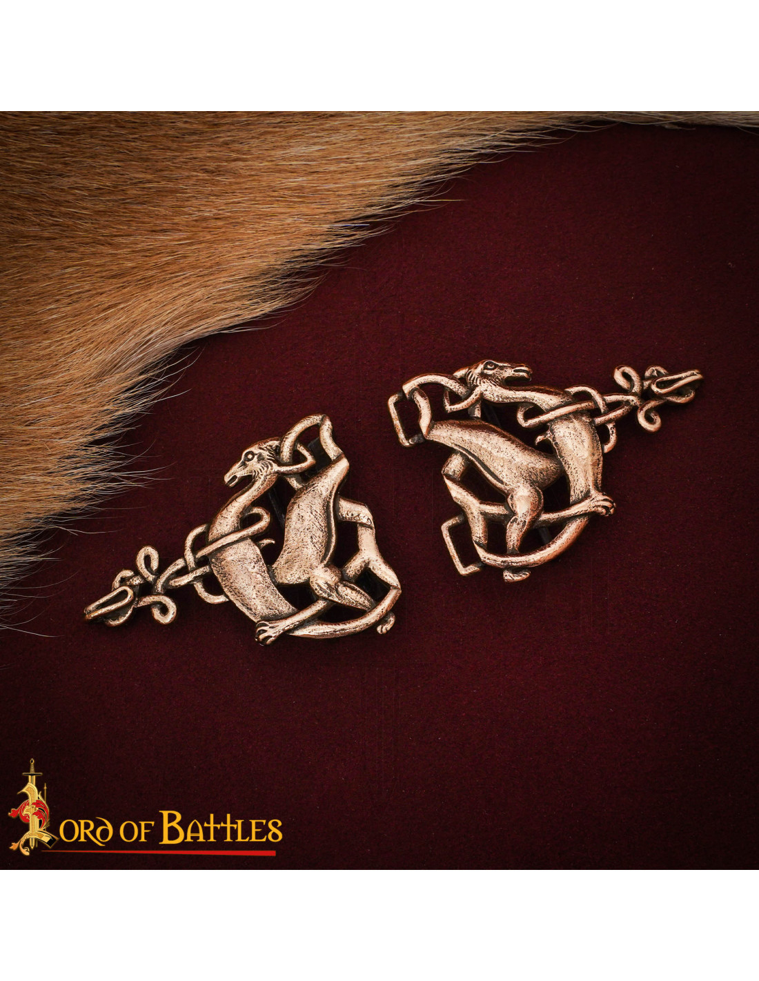 Com um motivo celta de cervos entrelaçados, as figuras opostas e a trabalhada trama de nós transmitem movimento e elegância, enquanto as linhas que simulam textura lembram a pele e o pelo estilizado de antigas peças medievais. Na fotografia, o brilho opaco do bronze sobre um tecido bordô intensifica sua presença, fazendo-o se destacar mesmo em cenas sóbrias.